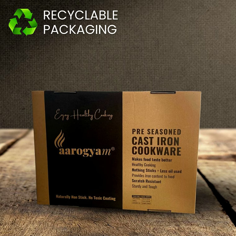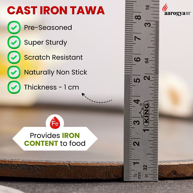 The Aarogyam Cast Iron Dosa/Chapati Tawa, sized at 12 inches (28 cm), is a premium cookware crafted from thick cast iron to offer superior heat retention and even heat distribution, ensuring perfectly cooked dosas, chapatis, uttapams, and other flatbreads every time. With a flat bottom design, this tawa is compatible with various heat sources, including gas stoves, induction cooktops, BBQ grills, and OTG ovens, providing versatile cooking options for professional kitchens and commercial food businesses. It is pre-seasoned for a naturally non-stick surface, free from harmful chemicals like PFOA, making it safe and healthy for prolonged usage. The sturdy single handle allows easy maneuverability, while rimmed edges prevent batter overflow, reducing food waste and mess. At a weight of 1.8 kg, it offers a solid, durable build that supports long-term commercial use without warping or degrade. This cast iron tawa enhances the flavor profile of traditional Indian dishes, imparting an authentic taste, while its non-toxic nature aligns with health-conscious cooking practices. The product is ideal for use in restaurants, hotels, catering services, and other food service settings aiming to serve high-quality Indian cuisine efficiently.