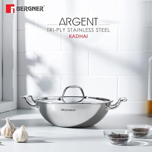 The Bergner Argent Tri-Ply Stainless Steel Deep Kadai 22 cm (2.8 L) with Stainless Steel Lid – BGIN-1543 is a compact and durable cookware piece designed for everyday cooking needs. With its 2.8-litre capacity and 2.5 mm thickness, it is ideal for deep-frying, preparing curries, gravies, vegetables, snacks, and small family meals.