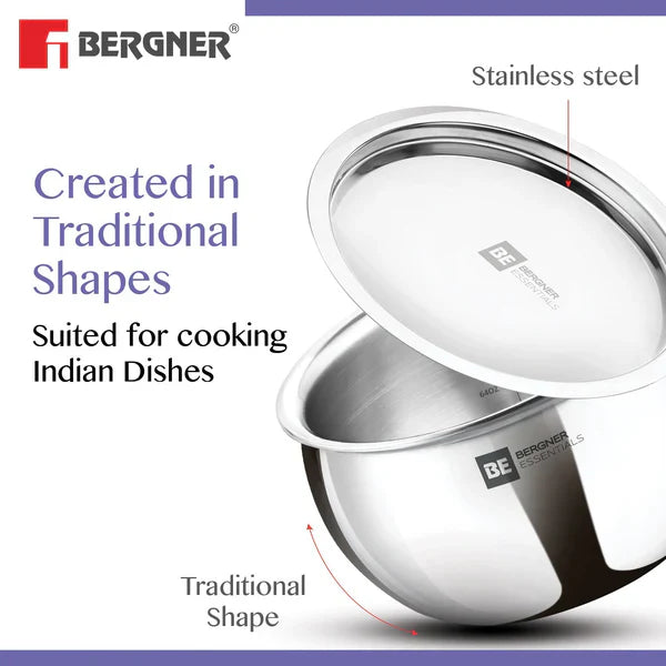 The Bergner BE Essentials Tri-Ply Stainless Steel Rice Handi 4L – BGIN-6245 is a spacious and reliable cookware solution designed for medium to large families and everyday cooking needs. With its 4-litre capacity, it is ideal for preparing rice, biryani, pulao, khichdi, curries, gravies, and wholesome one-pot meals.
