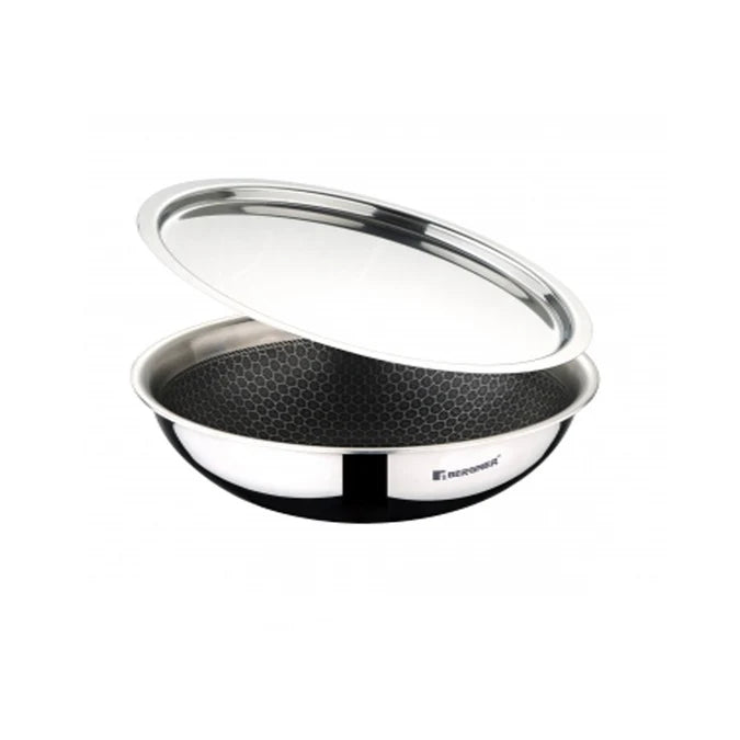 The Bergner Hitech Prism TriPly Stainless Steel Tasra 26 cm (3.6 L) (BG-31173-MM) is designed for healthy, efficient, and everyday cooking with consistent results. Built using advanced TriPly stainless steel construction, it features an 18/10 stainless steel inner layer for safe food contact, an aluminum core for fast and even heat distribution, and an 18/0 stainless steel outer layer for durability and compatibility with all heat sources. This construction minimizes hot spots and supports low-flame cooking, helping you prepare meals using less oil while maintaining reliable cooking performance.