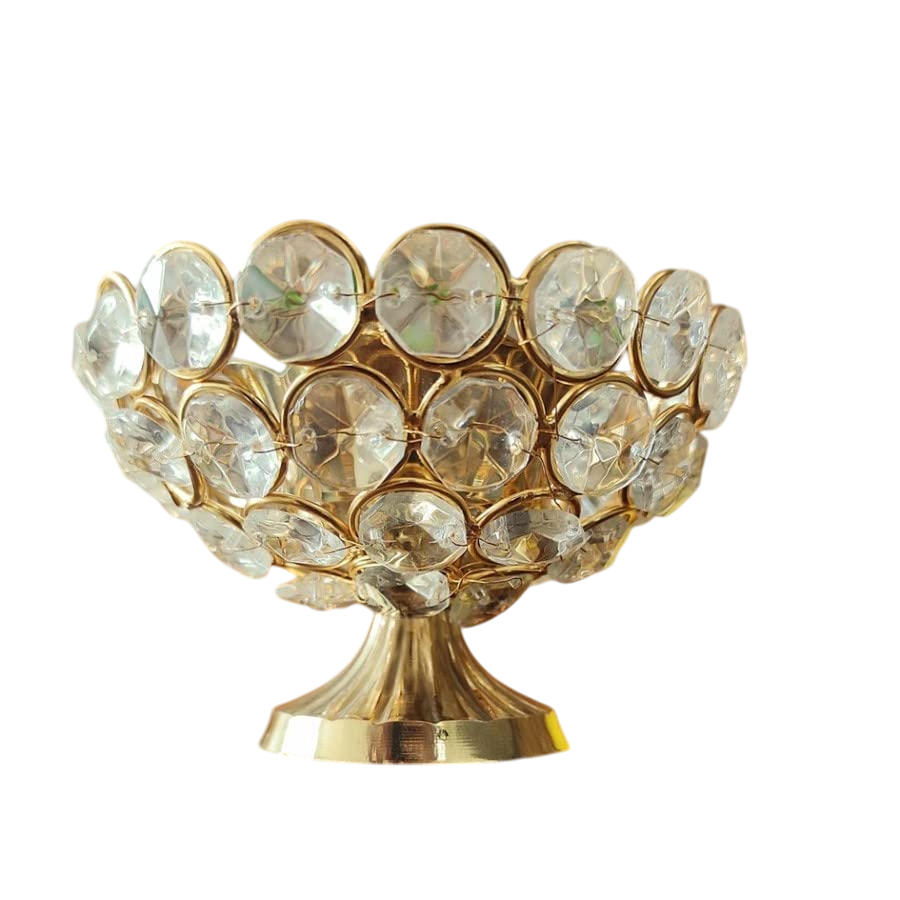 Illuminate your home with this stunning Crystal Round Akhand deepam Diya. Made from high-quality brass and adorned with beautiful crystals, this handmade diya adds an elegant touch to any space. It is perfect for Diwali Pooja or as a unique home decoration item. Bring the Indian festival of Diwali to life with this exquisite diya.