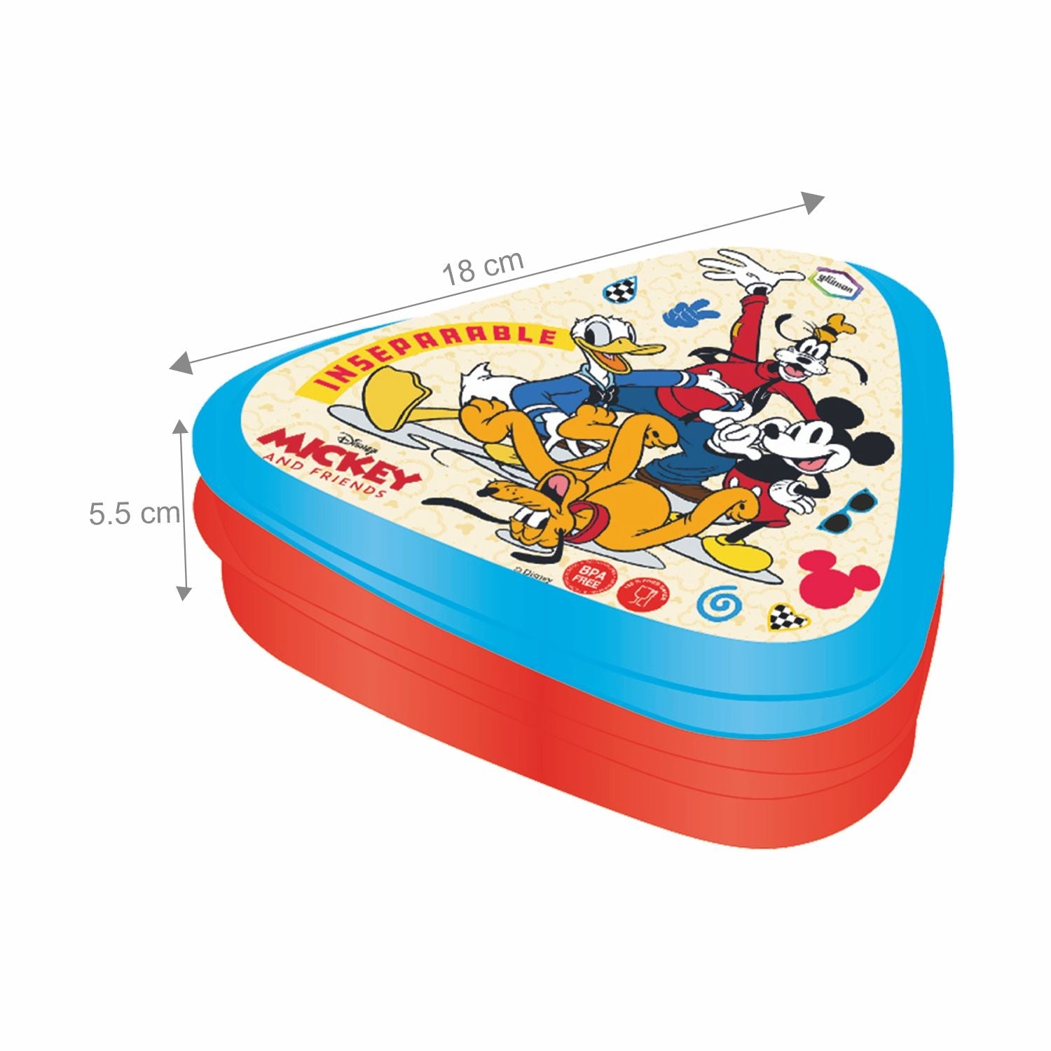 Make lunchtime fun and convenient with the GLUMAN Triangle Lunch Box Mickey 35720, featuring a 600ml main compartment and a 100ml small container for sauces or dips. Designed with an attractive Mickey Mouse print, this BPA-free lunchbox is perfect for school with a secure press-close lid that keeps food fresh for hours. Compact, lightweight, and easy to carry in any school bag.