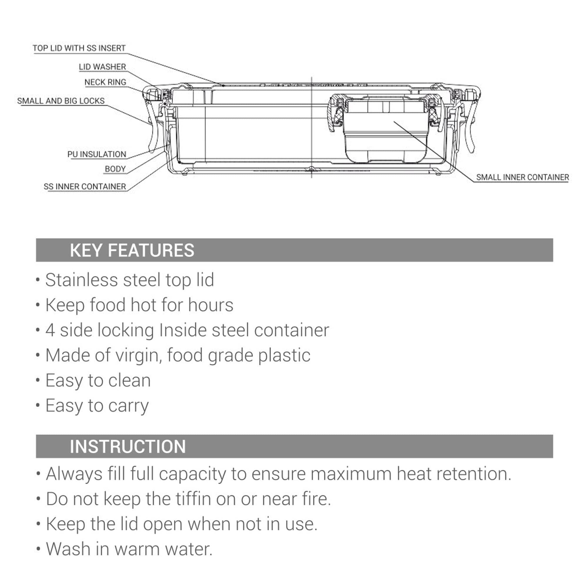 Details: The all new Steely Super Deluxe is a perfectly sized lunchbox for every use at office. It is an insulated tiffin with top steel lid and side locks, that comes with a high-quality stainless steel interior, a small leakproof steel container inside for gravy and curry and a steel spoon. It keeps your food hot for hours. The sleek design of the tiffin makes it easy to fit in the bag without occupying more space. Perfect to carry at school, office, while travelling, camping, picnics. This Product Is Under 1 Year Warranty From The Date Of Retail Purchase Against Any Manufacturing Defects In Material And Workmanship. The Warranty Does Not Cover Damages Resulting From Accidents, Mishandling Or Tampering With The Mechanism. Warranty Valid Against Producing Original Bill Endorsed By Seller.