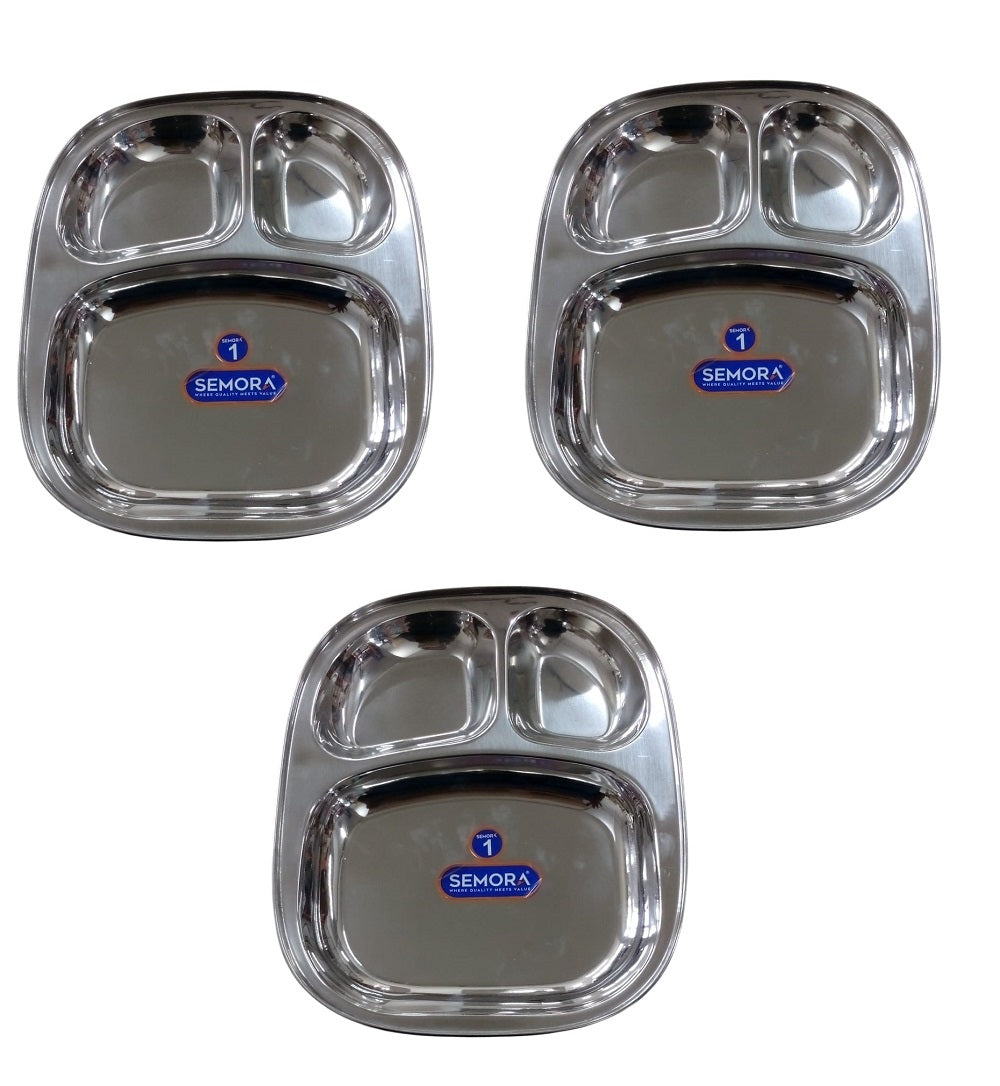 Organize your meals with ease using this practical stainless steel sectioned plate set. Each plate features three distinct compartments, perfect for separating proteins, vegetables, and grains without mixing flavors. Crafted from durable stainless steel, these plates resist corrosion and withstand daily use. Ideal for breakfast, lunch, or dinner, they work equally well for portion control, meal prep, or serving children. The compact size makes them perfect for smaller appetites or intimate dining. This pack of three ensures you have enough for the whole family. Easy to clean and built to last, these plates combine functionality with reliable everyday performance.