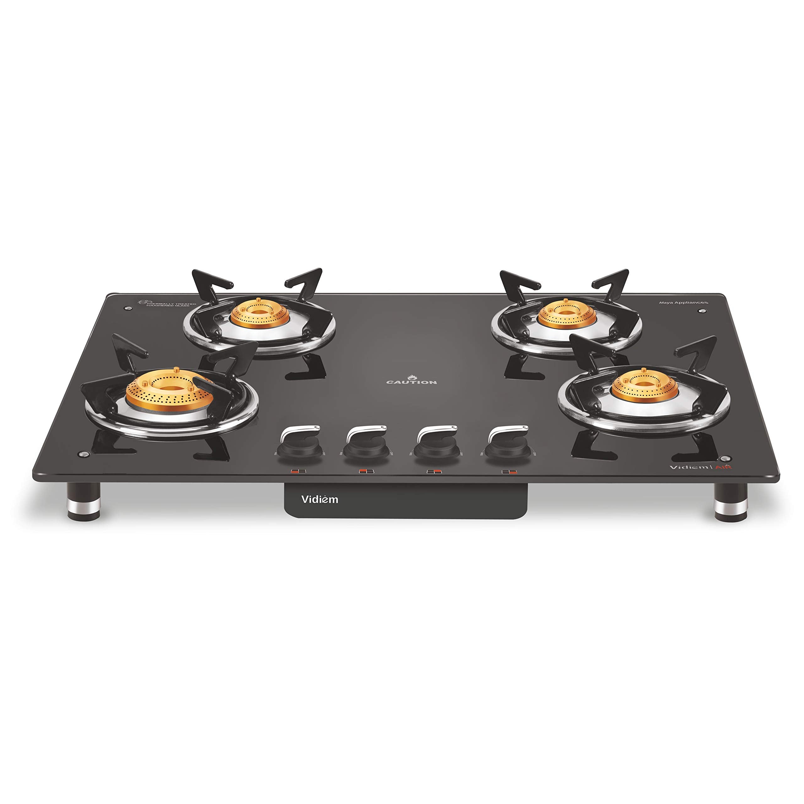 Details: Upgrade your kitchen with the Vidiem Air Silver 4 Burner Gas Stove, a perfect blend of innovative design, powerful performance, and long-lasting durability. Engineered with a sleek frameless 10mm toughened glass top, this stove is light as air yet strong as steel, offering a spacious cooking surface with widely spaced burners to accommodate large Indian vessels. Built with heavy-duty brass burners (Jumbo, Medium & Small) and aluminium mixing tubes, this stove ensures high-efficiency cooking while minimizing gas consumption. It features Direct Flow Gas Tubes to prevent blockages from dust and ants, making it safe and reliable for everyday Indian cooking. The vitreous enamelled pan supports, precision gas valves, and removable spill-proof drip trays make it a breeze to clean and maintain. With over four decades of expertise from Maya Appliances (since 1978), Vidiem guarantees unmatched quality, durability, and safety — backed by a lifetime glass warranty and a 2-year product warranty.