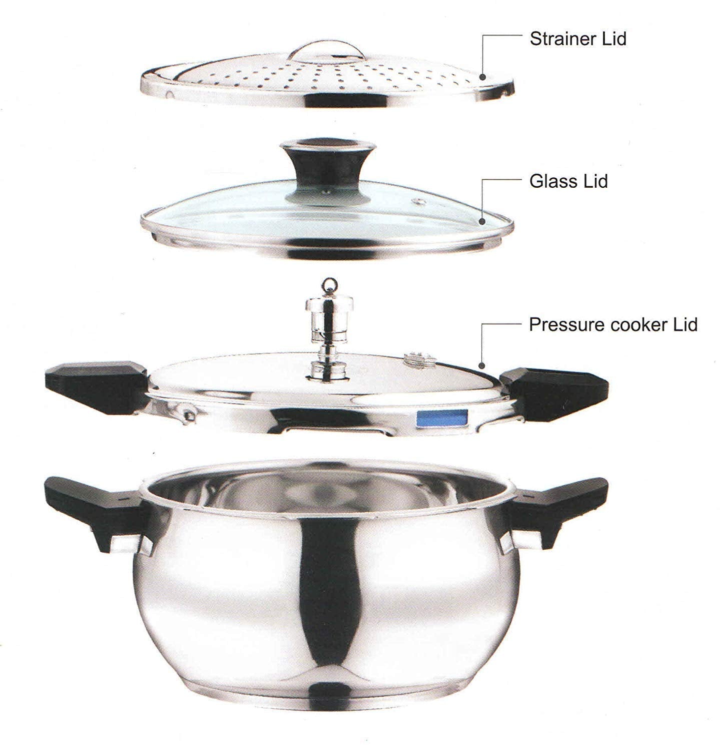 Details: 1 Pressure cooker with lid, 1 serving lid and 1 strainer lid. The colour of the product is Silver with Capacity of 5.5 Litres, This product is gas and induction compatible.